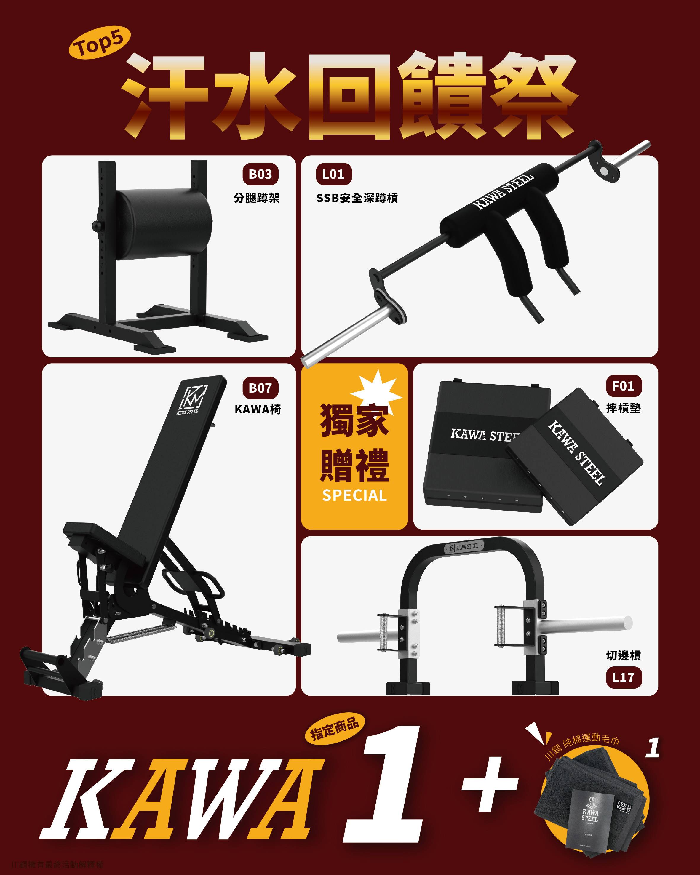 分腿蹲架,SSB 安全深蹲槓,KAWA 椅,摔槓墊,切邊槓,毛巾,贈送,優惠活動
